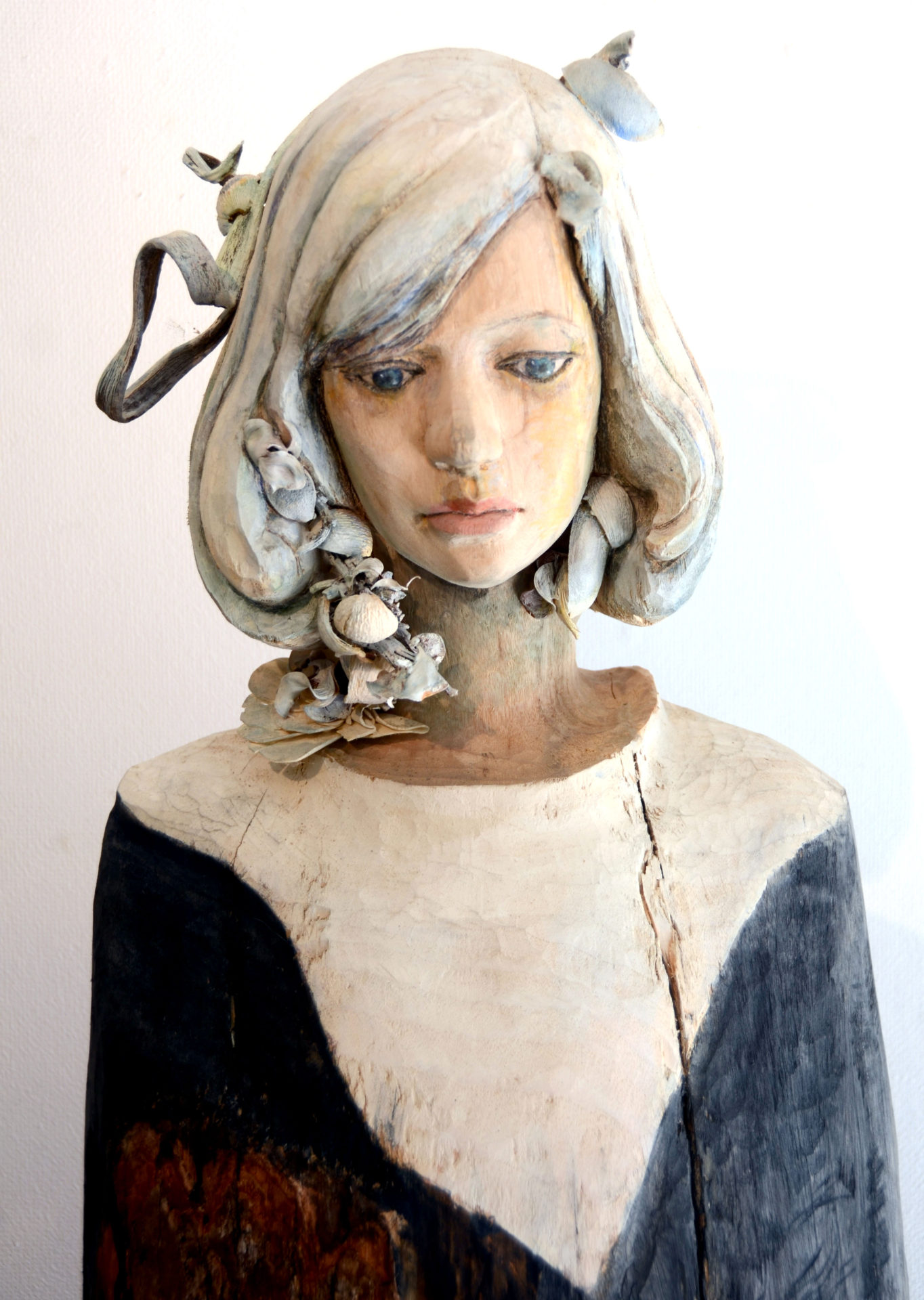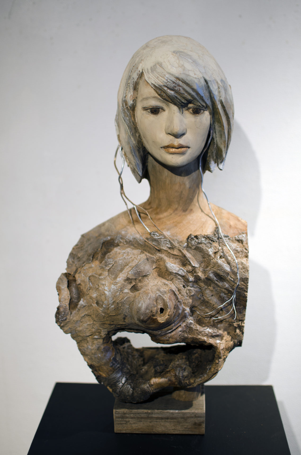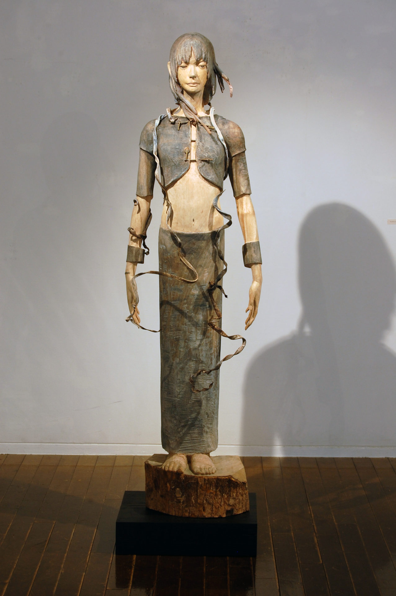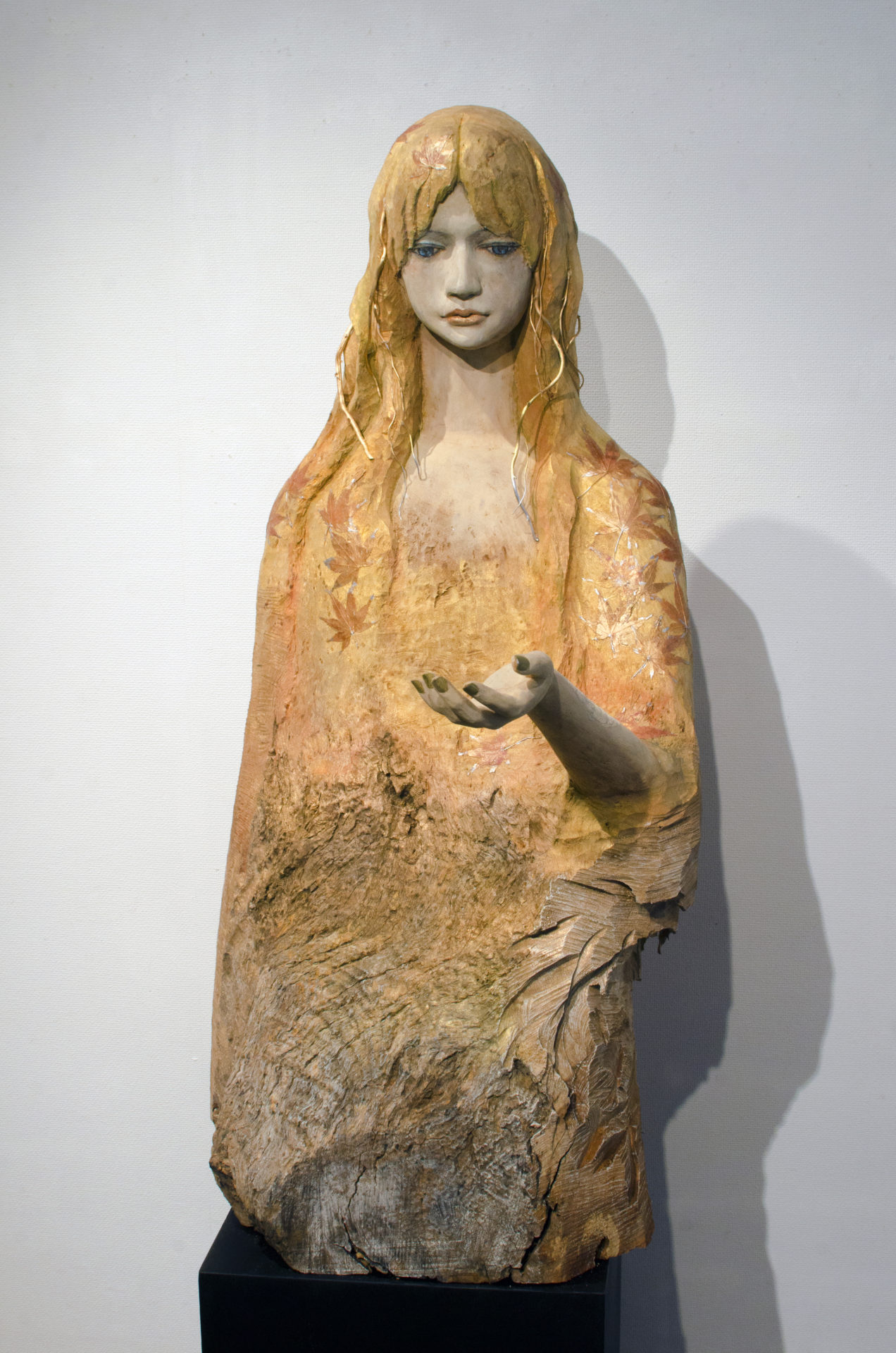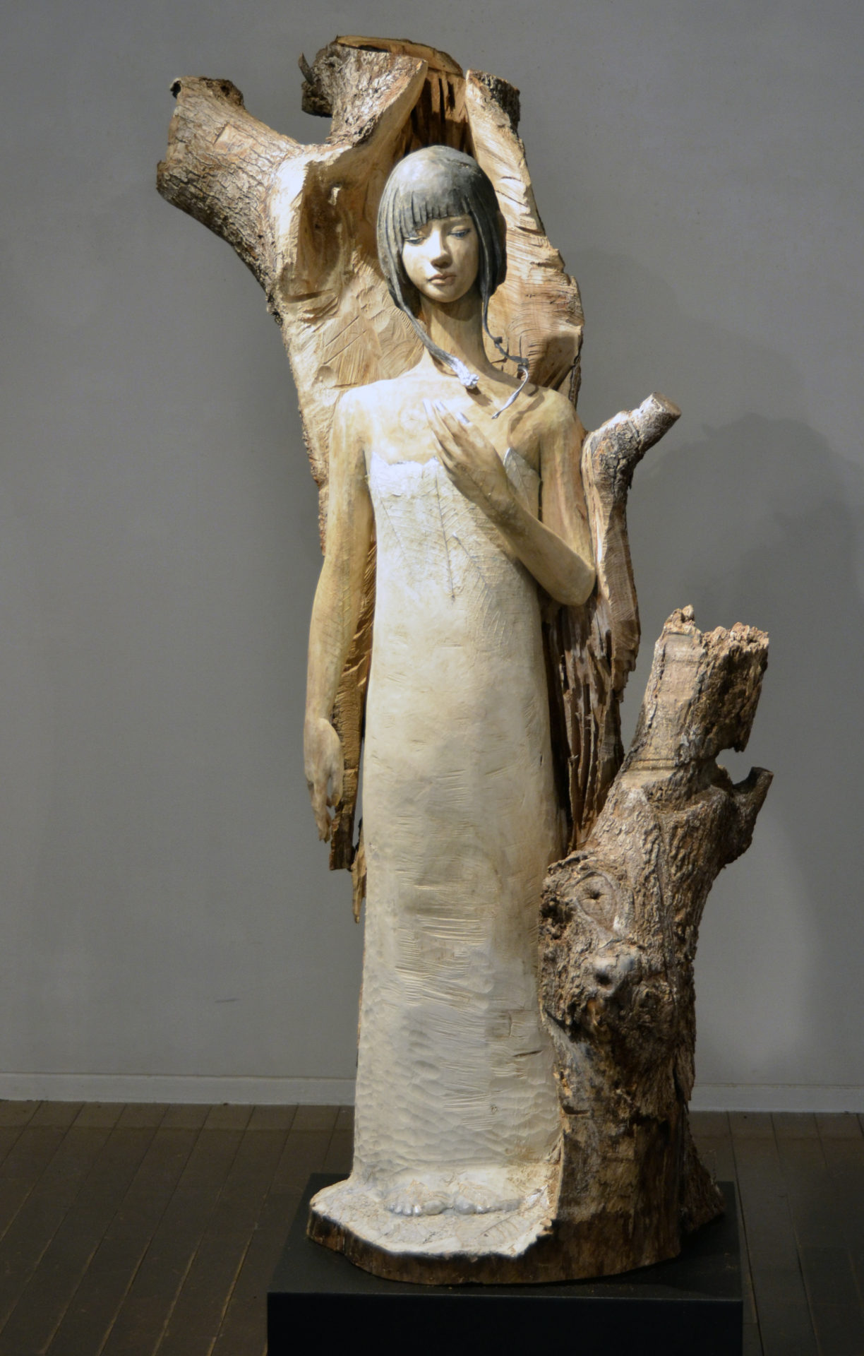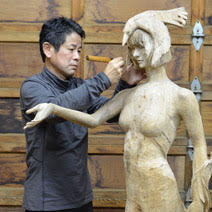 立花光朗は、吉野毅氏の教えを受け東京芸術大学に入学し、大学では深井隆氏に師事し、木彫作家としての礎を築きました。その流れを汲むかのように、人体彫刻と抽象的物語性を合わせた表現を追求しています。一体一体に物語を創造し、その樹のもつ時間の流れや景観を感じさせるような神秘的な世界観を見せてくれます。