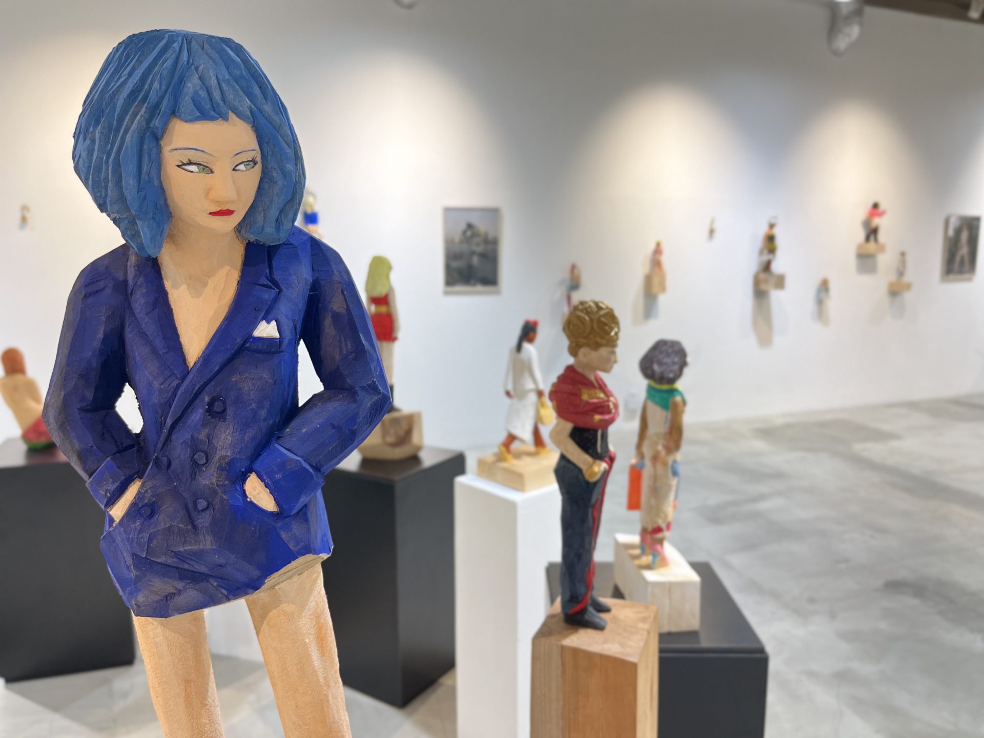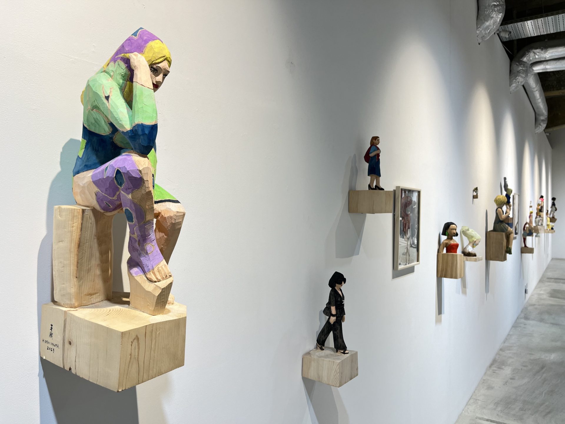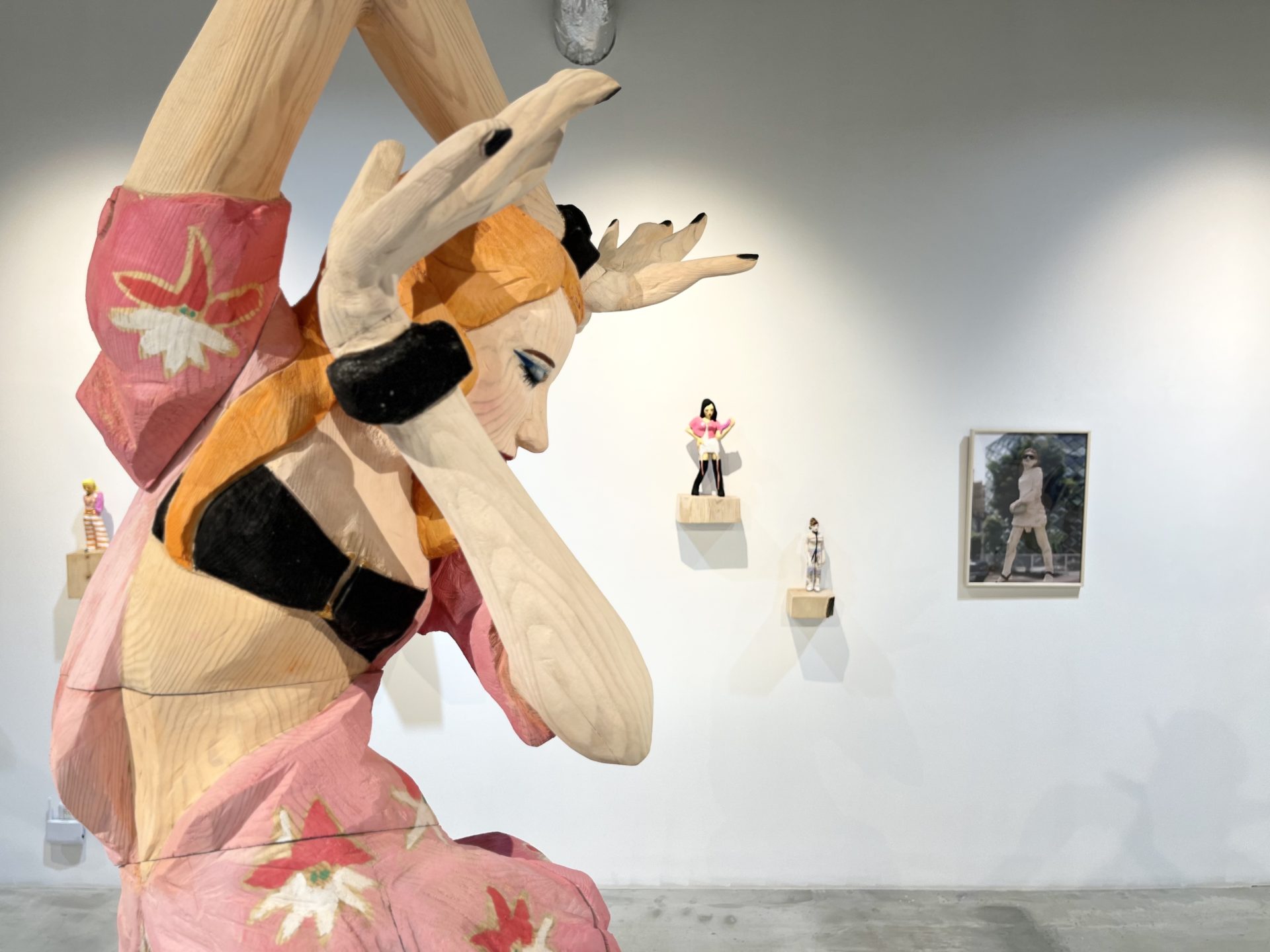 IINUMA's sculptures, carved from single trees, feature a rough exterior that retains the wood's bark, reflecting the essence of contemporary women living in a consumer society. Iinuma often photographs her sculptures in real-world settings, such as urban streets and natural landscapes. This dynamic combination of sculpture and background creates a fresh and diverse visual experience, stimulating the viewer's imagination and revealing new dimensions of the sculptures.