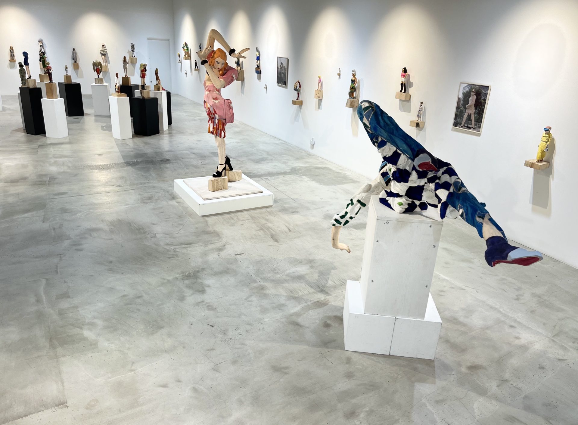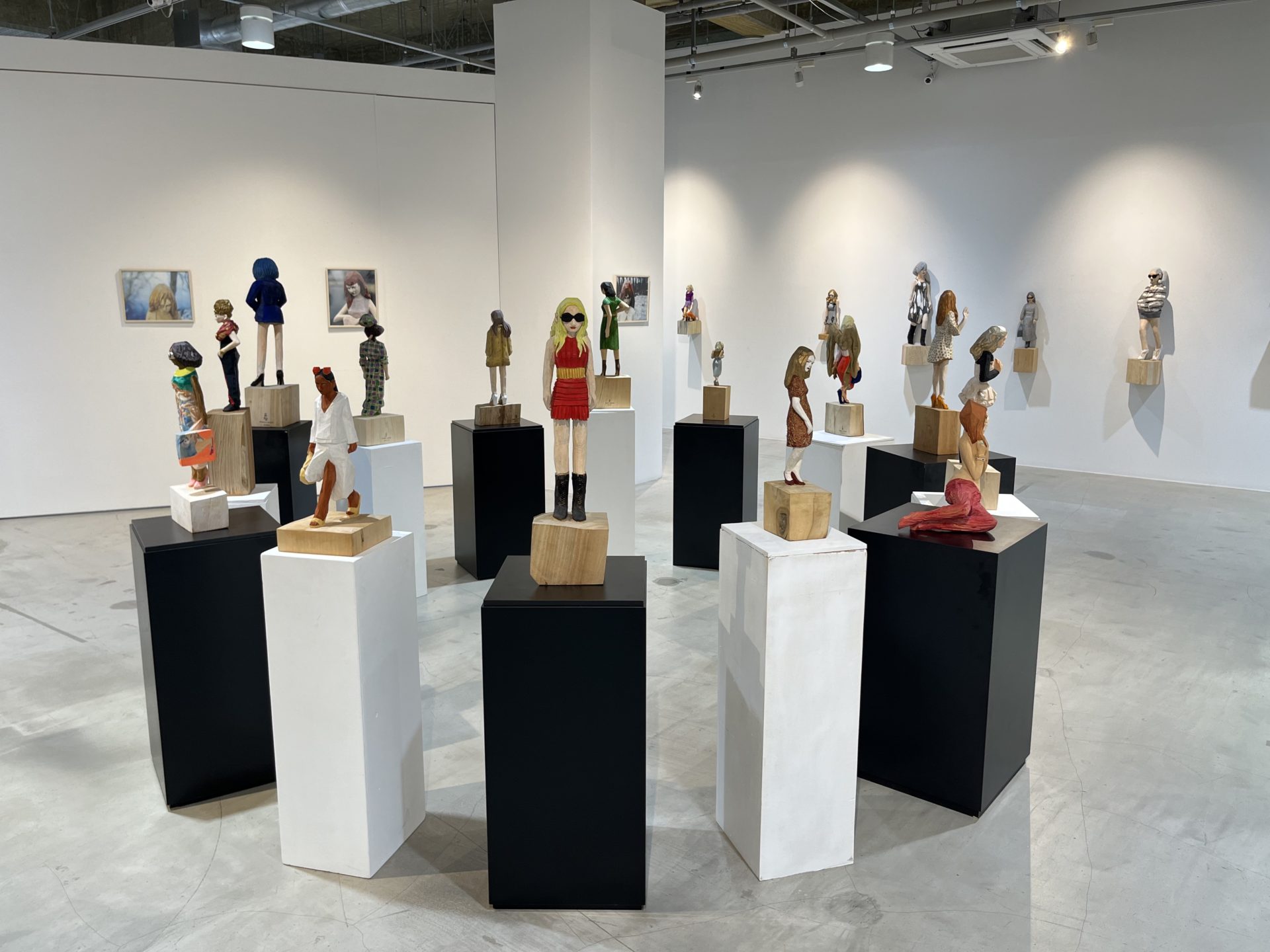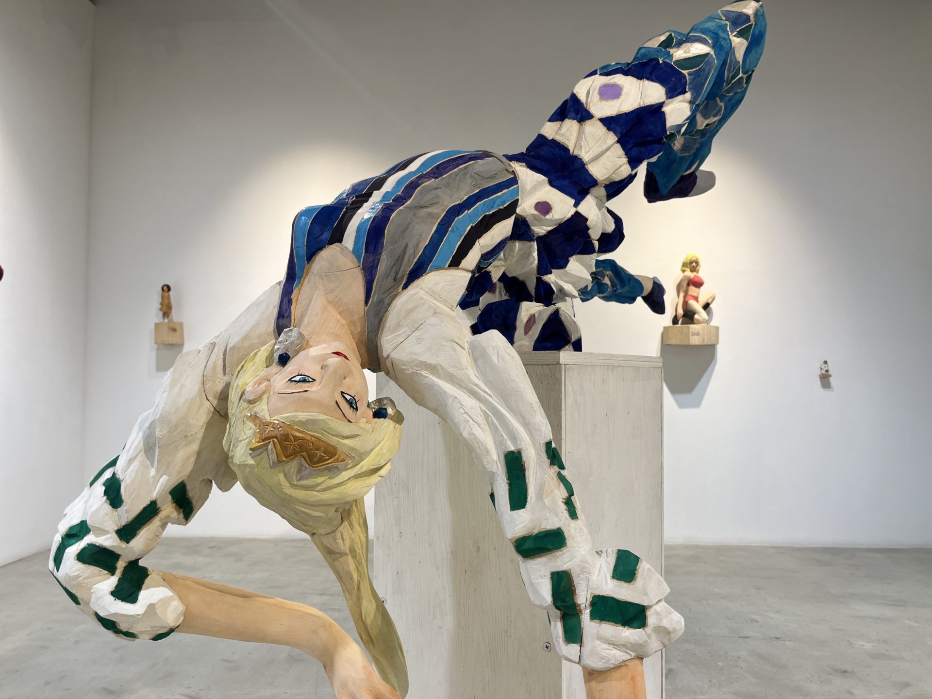 IINUMA's sculptures, carved from single trees, feature a rough exterior that retains the wood's bark, reflecting the essence of contemporary women living in a consumer society. Iinuma often photographs her sculptures in real-world settings, such as urban streets and natural landscapes. This dynamic combination of sculpture and background creates a fresh and diverse visual experience, stimulating the viewer's imagination and revealing new dimensions of the sculptures.