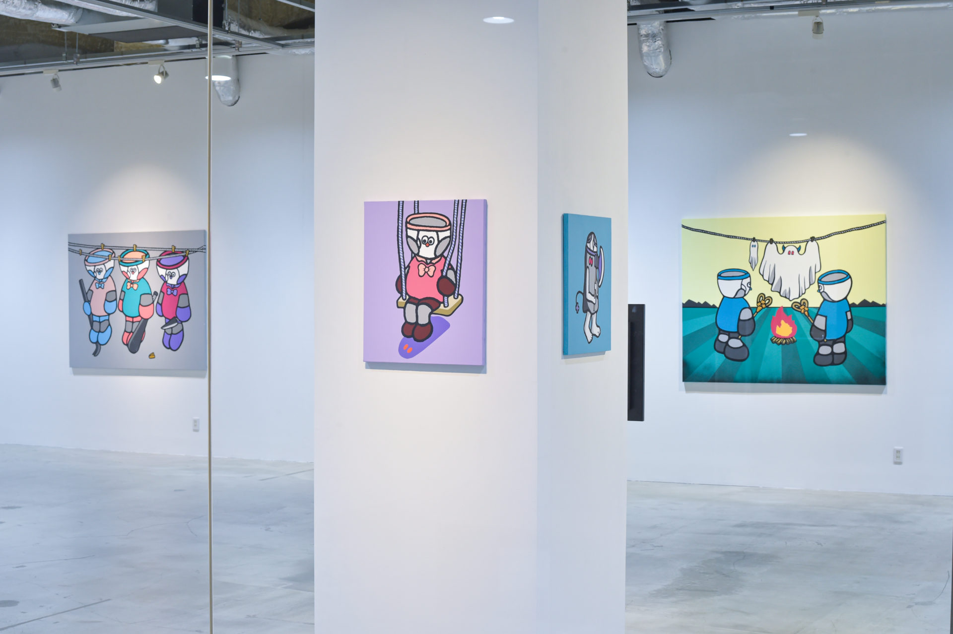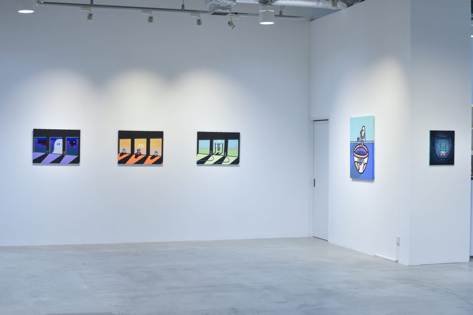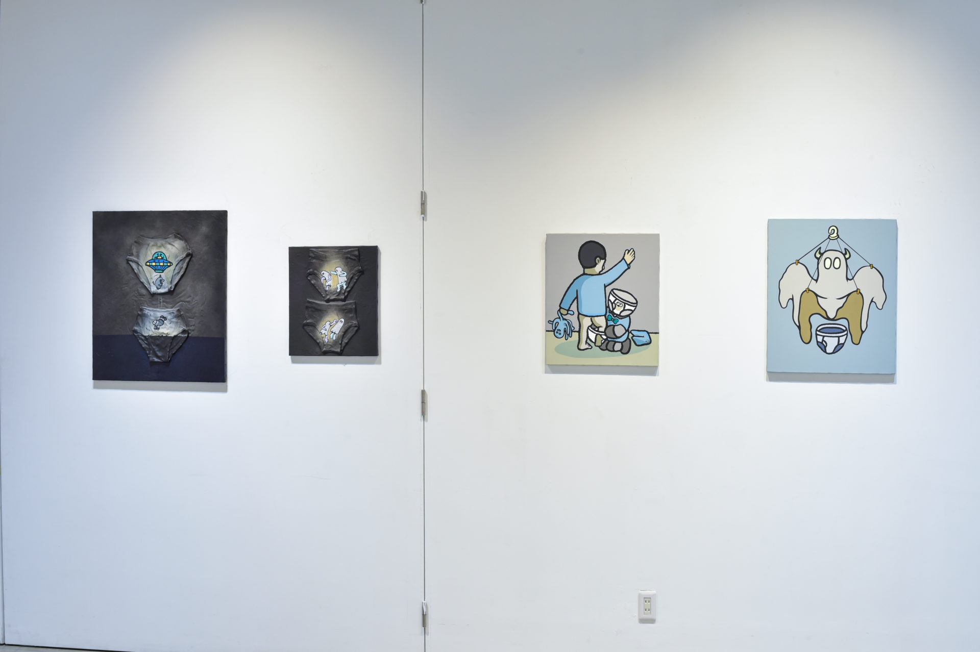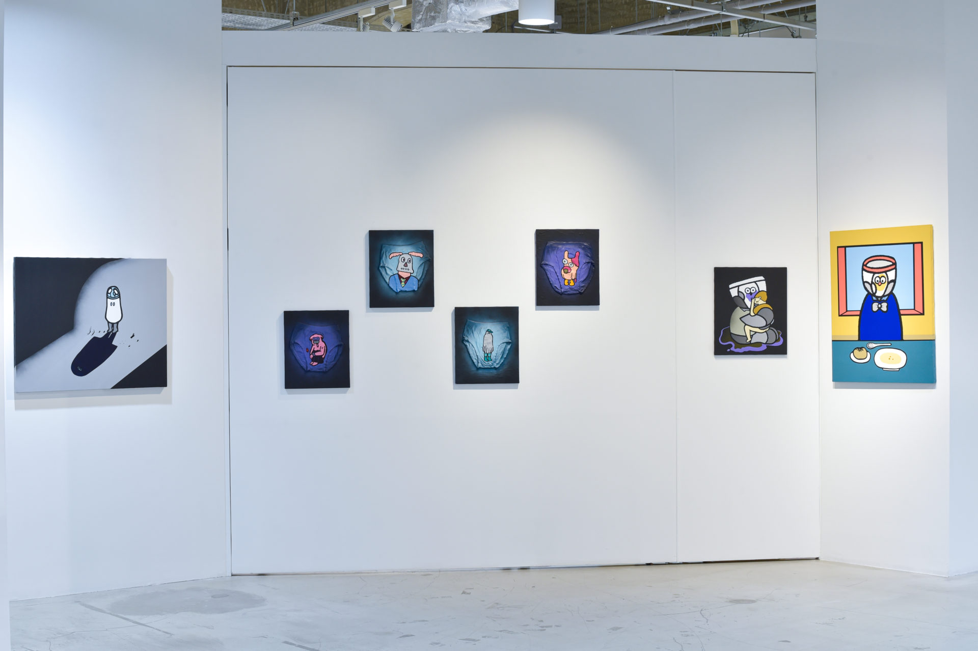 In recent years, he has begun to work more on canvas, and the brief that used to be his material to paint on, has appeared as a hero in his paintings. As his child was born and grew up, the characters overlapped with his own childhood memories and came to be projected more vividly.