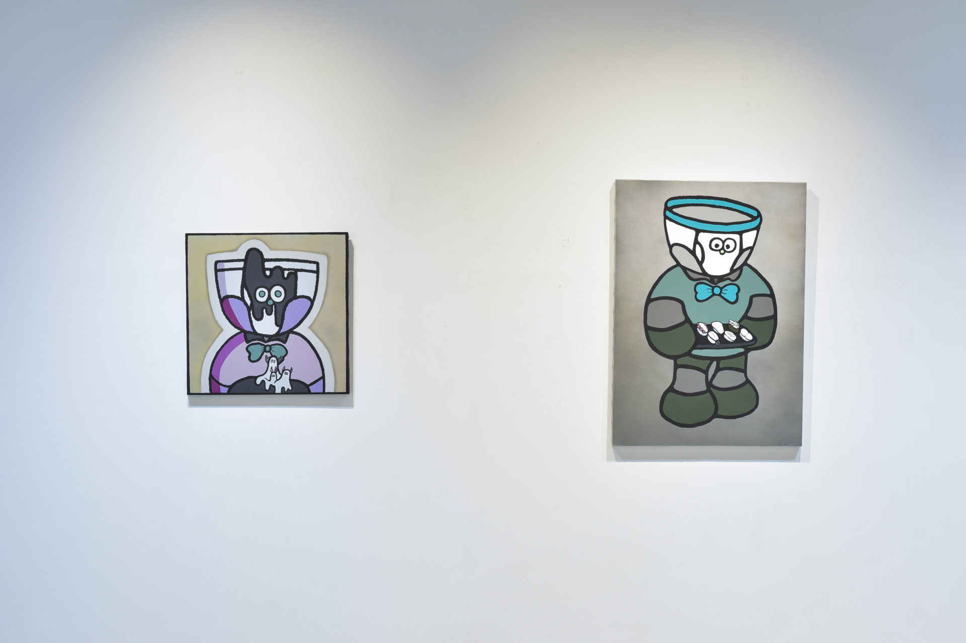At the same time, his work, composed of clear, bold outlines and simple, vividly colored backgrounds, and further comicalized, contains elements of Superflat which has been gaining attention in the contemporary Japanese art scene.