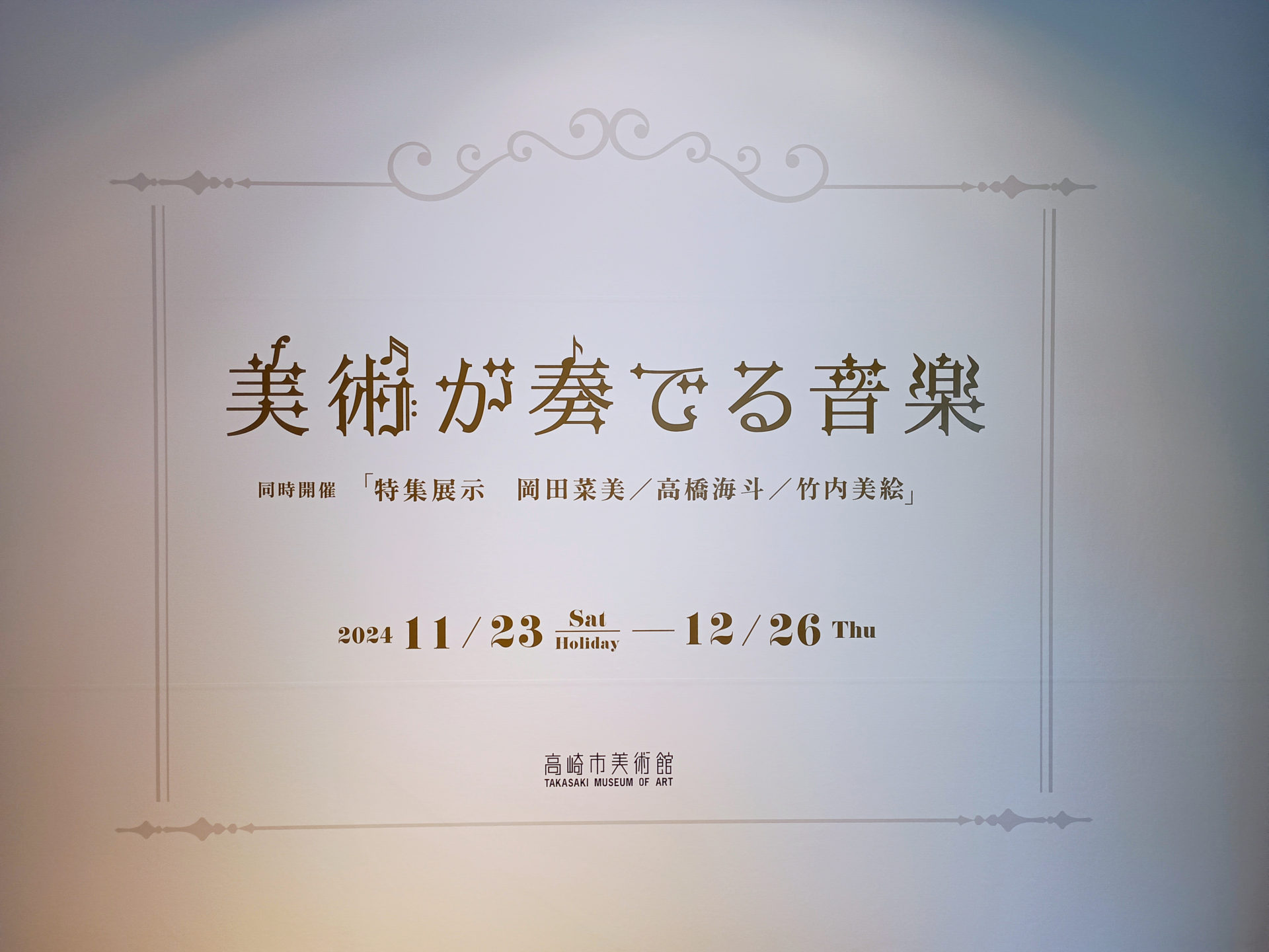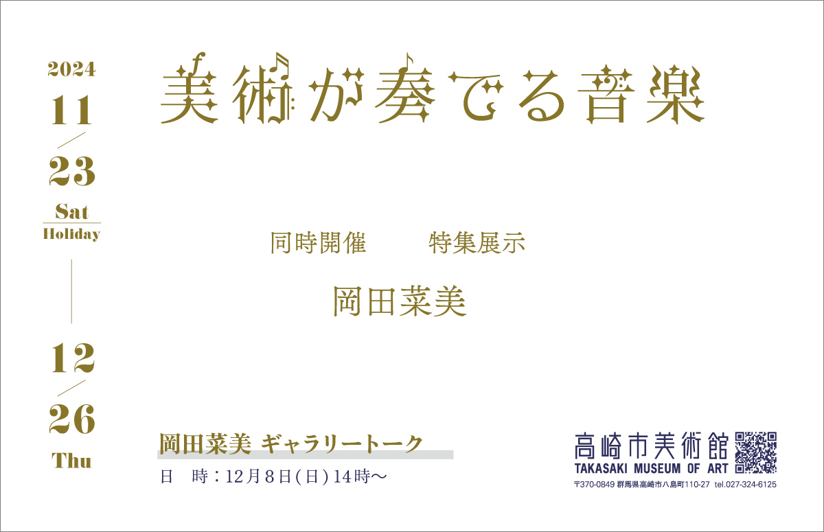 We are delighted to announce that Nami Okada, our exclusive artist, will be participating as one of three local artists in a special exhibition at the Takasaki Museum of Art. This event is held in conjunction with the Music Played by Art exhibition, featuring a collection of curated works.